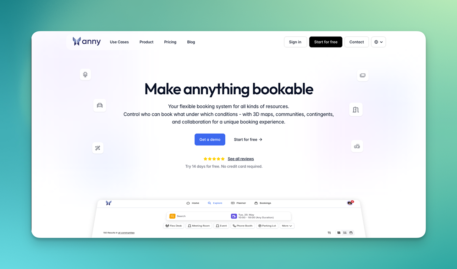 anny is a cloud based desk booking system from Germany that brings together the management of workspaces, meeting rooms, parking spaces and other office resources in one platform. The software is used for workspace management in hybrid offices, room bookings, visitor management and event or resource calendars.