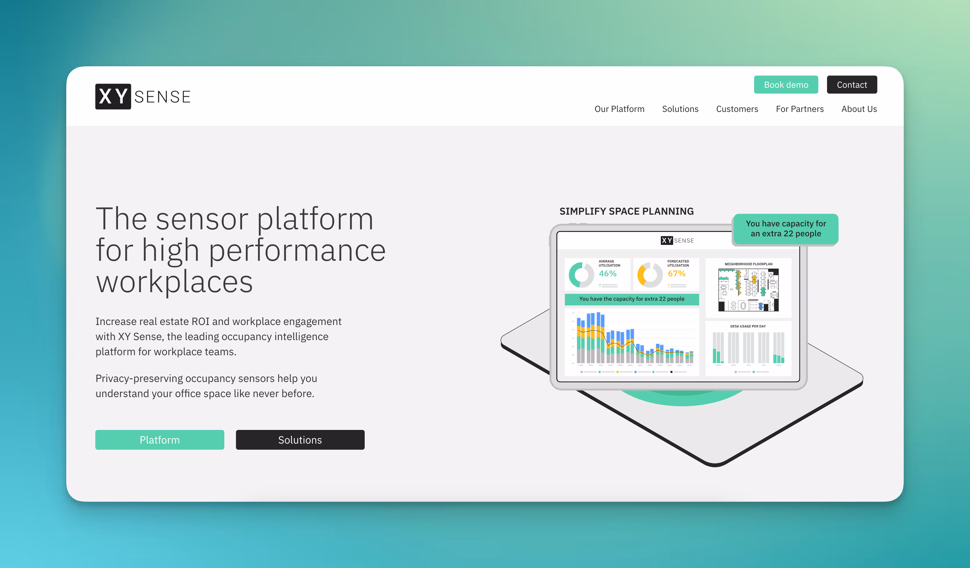 The sensors process data directly on the device; raw images or personal information never leave the sensor. Only anonymized occupancy data is transferred to the cloud. XY Sense is GDPR and CCPA compliant and ISO 27001 certified.
