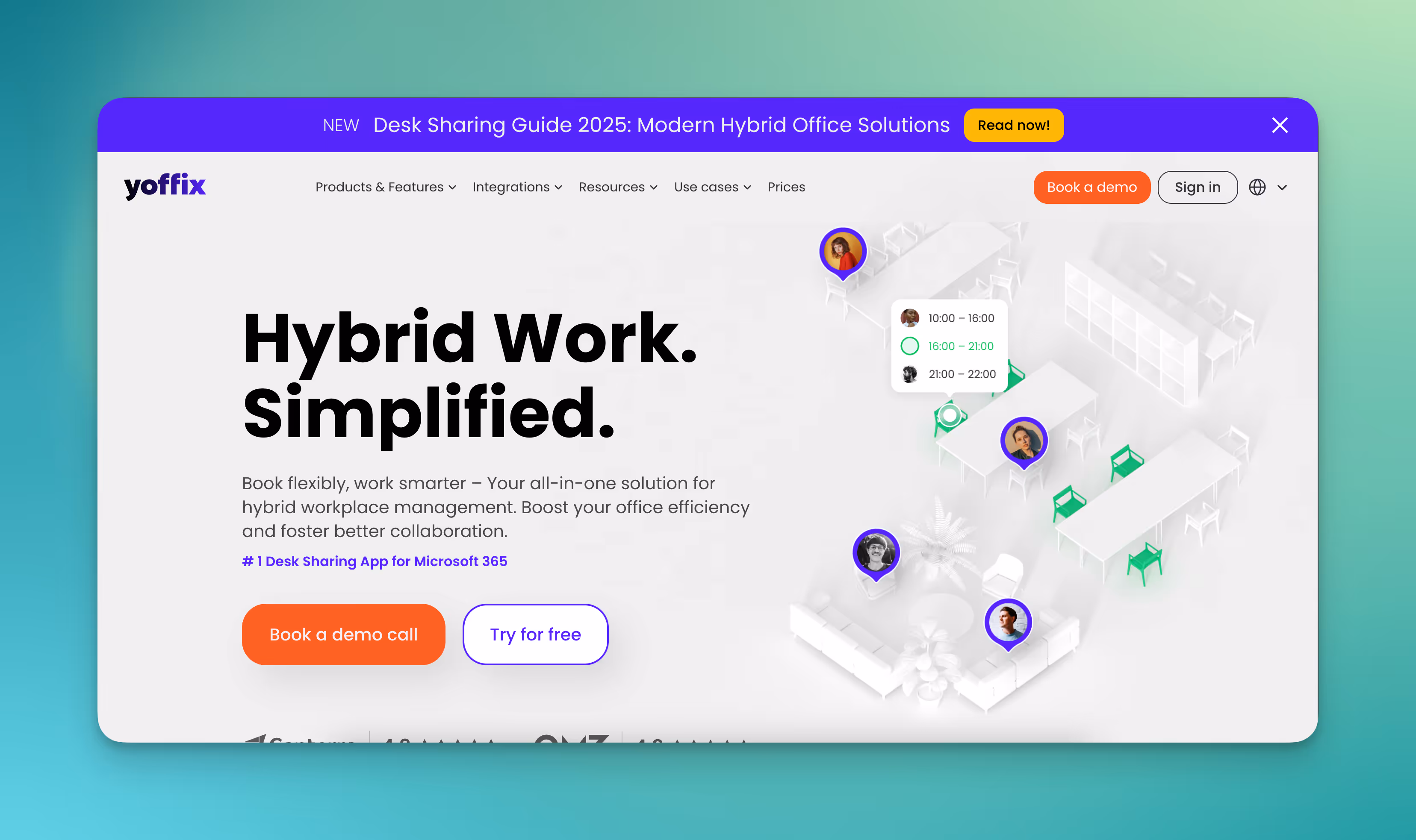 Yoffix ist eine Software für Arbeitsplatzmanagement mit Fokus auf Unternehmen, die Microsoft 365 oder Outlook als Arbeitsumgebung nutzen. Die Software unterstützt die Buchung von Ressourcen und das Management hybrider Arbeitsmodelle.