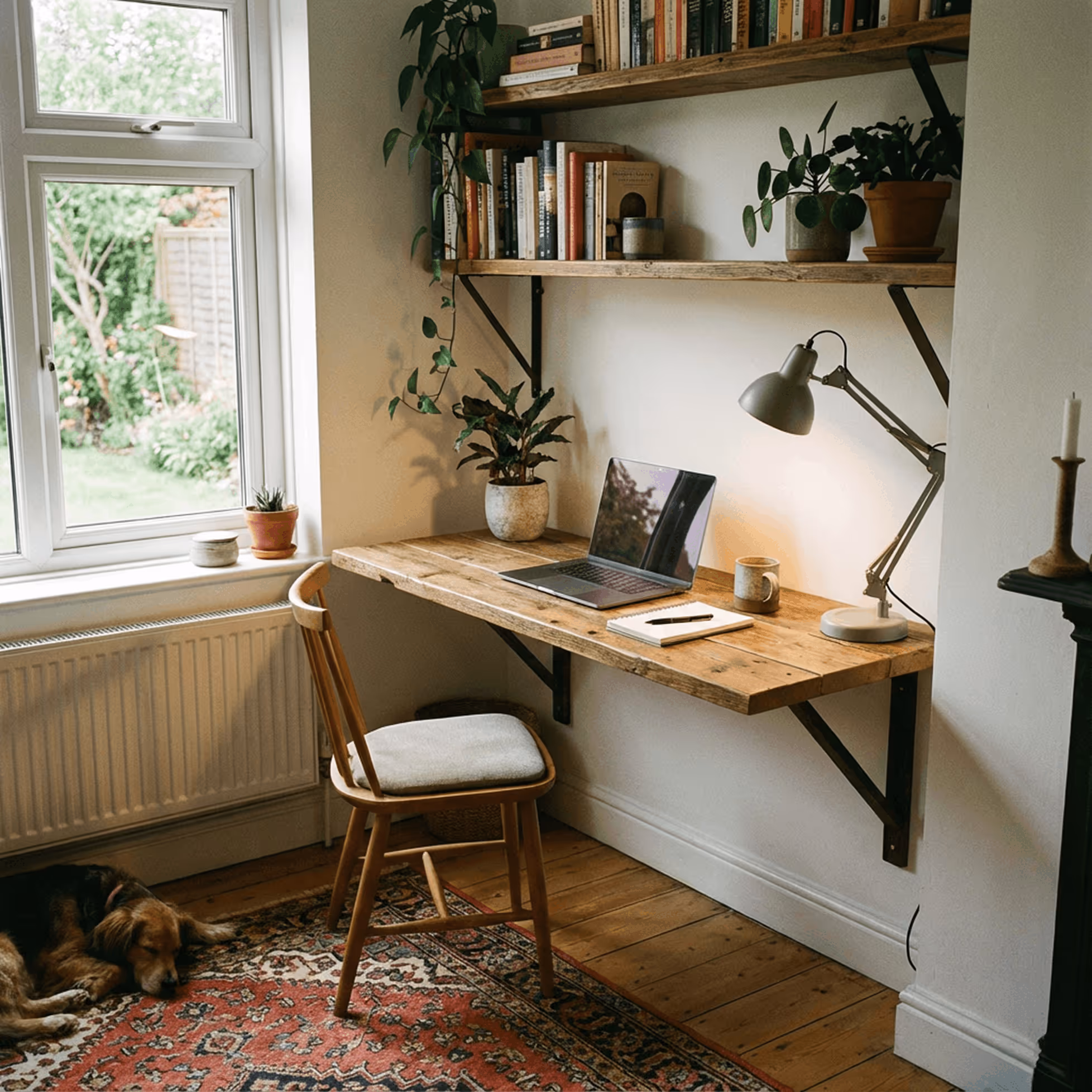 - Nutze einen kleinen Teppich, ein Regal oder einen Paravent, um deinen Arbeitsbereich optisch abzutrennen.