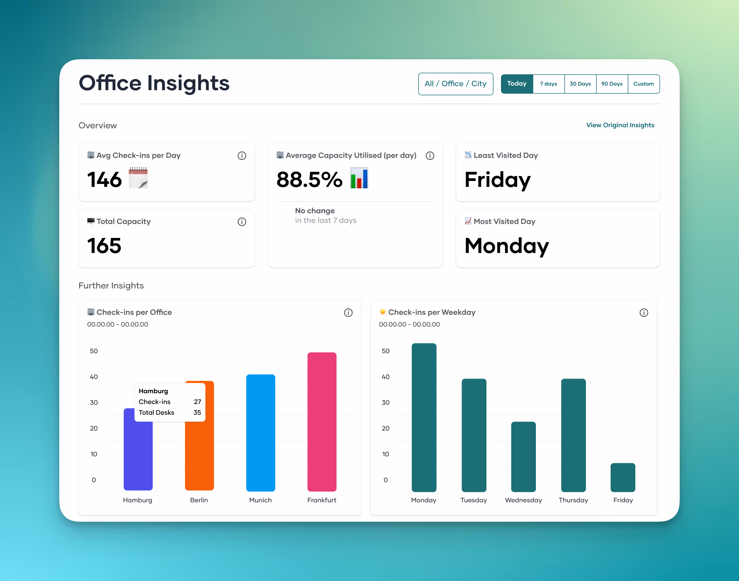 Besonders wertvoll sind Daten zur tatsächlichen Nutzung von Arbeitsplätzen und Besprechungsräumen. Sie zeigen dir, welche Flächen stark nachgefragt sind und wo Optimierungspotenzial besteht, sodass du dein Büro bedarfsgerecht weiterentwickeln kannst.